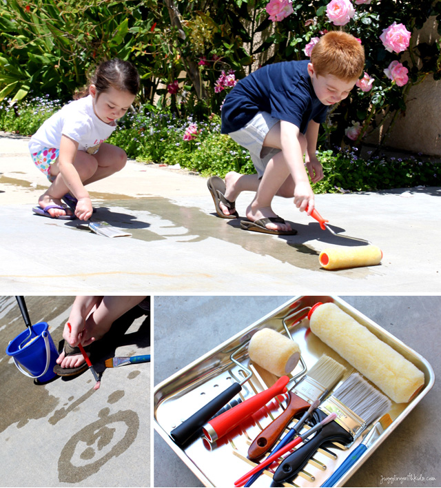 А ще водою можна малювати! Для цього знадобляться всілякі пензлики, валики і, власне, вода. А діти вже самі знайдуть, що і як їм "розфарбувати". На асфальті також зручно малювати бризкалкою з пластикової пляшки з дірочкою в кришці.