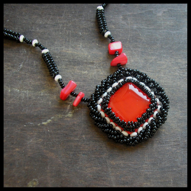 Материалы: стеклянный полупрозрачный кабошон, бисер, бусины из ракушек, леска, магнитная застежка.