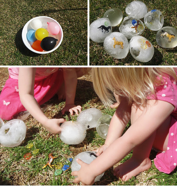 Заморозьте воду у повітряних кульках, всередину можна покласти якісь кольорові предмети. Вийдуть дуже цікаві льодові яйця.