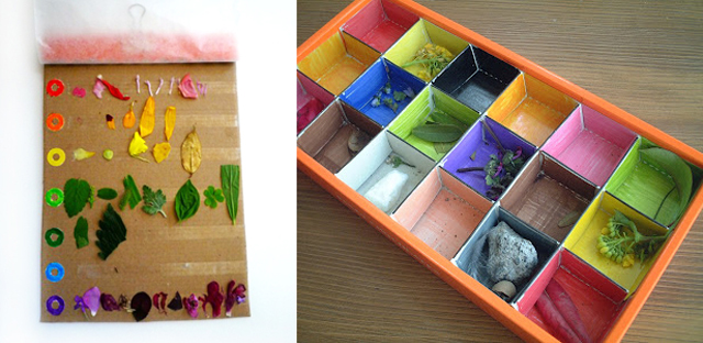 На прогулянку можна піти зі спеціальним завданням - відшукати рослини певних кольорів. Знайдені екземпляри можна приліплювати на двосторонній скотч або класти у відсіки якої-небудь картонної коробки або, наприклад, від яєць.