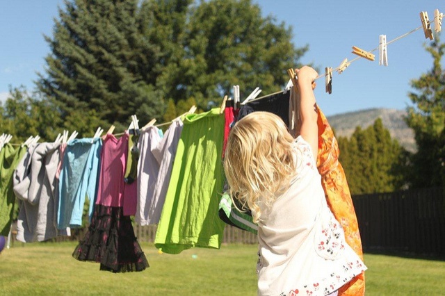 Наприклад, сушка білизни. Якщо у вас є можливість, то сушіть випрану білизну на вулиці. Натягніть мотузку спеціально для малюка, щоб він до неї діставав. Покажіть, як правильно розвішувати білизну на прищіпки. Хай дитина розвішує невеликі речі: носочки, трусики, свої футболочки та маєчки.