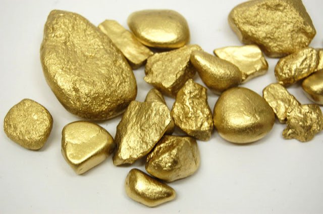 Чудова ідея - пофарбувати звичайні камені золотою фарбою (краще з балончика). Вийдуть справжні скарби і золоті самородки. Також можна пофарбувати і дрібні монети. Для домашньої пісочниці можна придбати набори цікавих камінчиків, які продають для акваріумів.