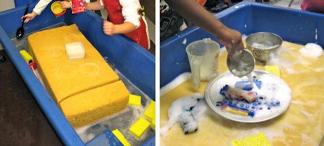 Якщо у вас десь завалявся поролоновий матрац, наприклад, від старого дивана чи крісла, то просто дайте його дітям, і вони самі придумають йому застосування. Адже якщо покласти його в воду, то він вбере її і стане важким, якщо додати трохи мила, то буде багато густої піни, а ще на паралоні залишаються відбитки, якщо щось в нього втиснути.