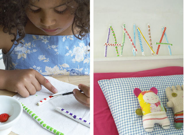 Із пофарбованих гілочок дуже просто зробити гарні літери, з яких можна скласти якісь слова або імена.