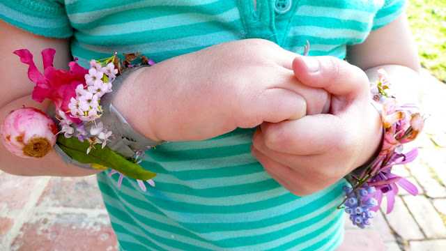 Такий браслет робиться з скотча, липкою стороною вгору, і потім дитина сама приліплює на нього квіти на свій смак і колір. Можна приліплювати також пісок, черепашки та камінці. Для цього краще взяти липкий двосторонній скотч, нижній шар якого просто не відклеювати.