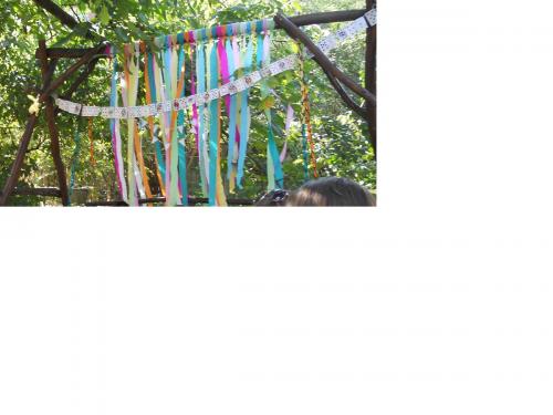 Деревянные качели украсили полосками из гофрированной бумаги, которые развевались по ветру и гирляндой из игральных карт. Вот такой у нас был праздник.