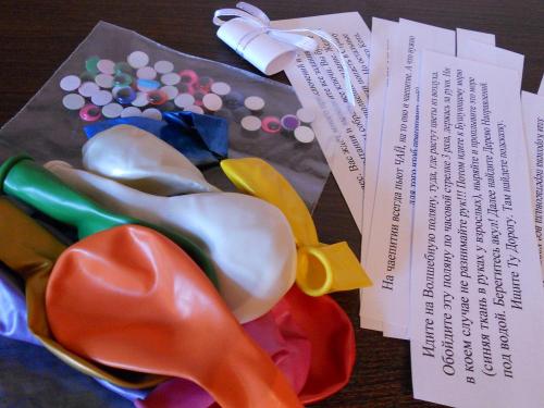 «Идите на Волшебную поляну, туда, где растут цветы из воздуха (у нас были цветы из воздушных шариков). Обойдите эту поляну по часовой стрелке 3 раза, держась за руки. Ни в коем случае не разнимайте рук!!! Потом идите к Бушующему морю (синяя ткань в руках у взрослых, они машут ею, пытаясь поймать проплывющих), ныряйте и проплывите это море под водой. Берегитесь акул! Далее найдите Дерево Направлений. Ищите Ту Дорогу. Там найдете подсказку.». На дереве висят указатели: Туда, Сюда, Та дорога, Вверх, Вниз, Эта дорога.