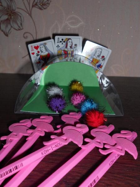 9. В оранжевом шарике с короной записка «Злая Королева перетасовала все карты. Найдите пары». Просим детей на скорость найти парные карты в праздничной комнате (ими украшена комната), например: туз бубновый к тузу бубновому и т.д..