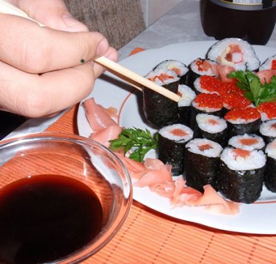 Гострим ножем розріжте рол на рівні, охайні шматочки. Прикрасьте суші червоною ікрою. Поставте на стіл тарілочку з соєвим соусом. Насолоджуйтесь екзотичним смаком японської кухні у себе вдома ![]()