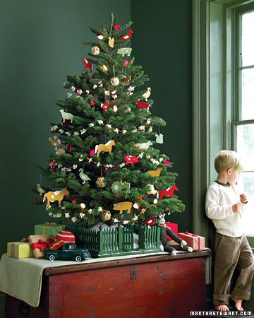 Дитяча ялинка повинна бути густою, яскраво декорованою та незвичайною. Ця ялинка прикрашена гірляндами та кулями з попкорну, фігурками тварин, виготовленими з фетру яскравих кольорів. А біля підніжжя ялинки - дерев'яна огорожа, пофарбована у зелений колір.