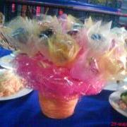 Я колись робила такі невеличкі букети для рідних в подарунок. Фото, на жаль, не зробила. Але там все було просте. На великі букети не хватає грошей :). Треба багато цукерок, а хосчеться щоб і смачні були, а то влітає в копійчину. Я інколи ще прикрашаю подарунки невеличким букетиком з 3 цукерок, там розочки, проліски. Щось простеньке.
