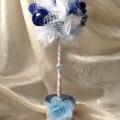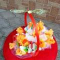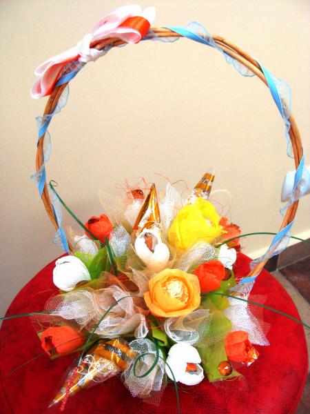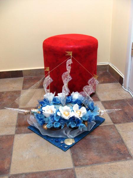 Дякую. Загалом процес досить розтягнутий у часі. Потрібно закупити матеріали (в Ужгороді з цим проблема). Придумати ідею букетика, а потім знову ж докупити потрібні декори і цукерки (не бажано їх купляти заздалегідь...). А потім-до праці. Загалом, можна букет зробити за пару годин, а, наприклад, кораблик зайнав у мене 3-4 доби на втілення.