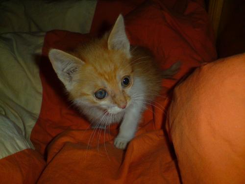 У мене котик. ми його знайшли (вірніше підібрали ледве живого у дуже поганому стані з проїжджої частини дороги в 22години) коли я була на 3 місяці. Рижик, так ми його назвали. Наш рижик був сліпий на обидва ока, важив десь 100гр. (йому приблизно 2-3 місяці було, то вже ветеринар потім сказав)одно око, ми думали, що в нього взагалі витекло. Цілу дорогу додому я плакала і проклинала тих людей які викинули його маленького хворого на вулицю помиратиПлач.