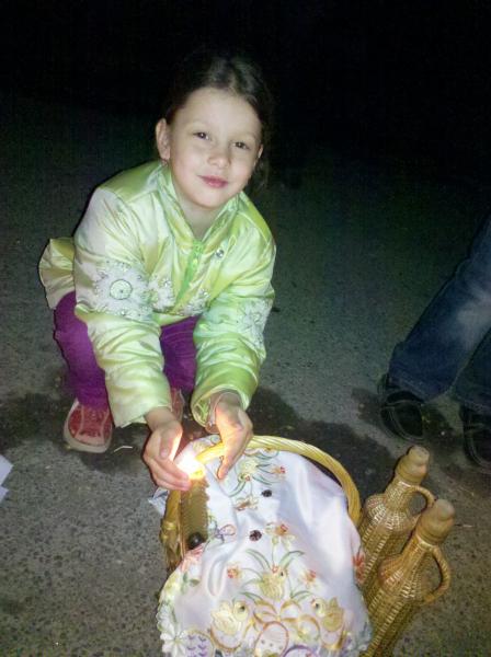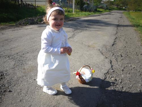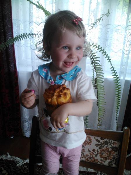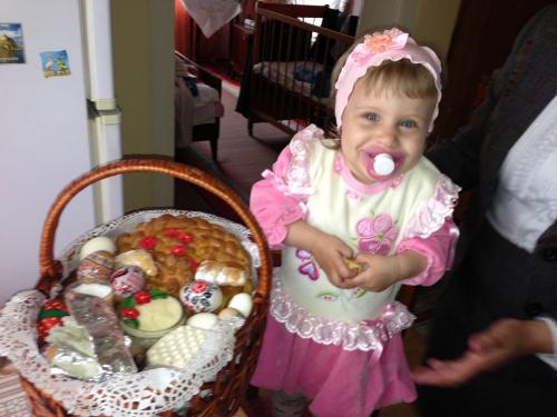 Алинка пришла с церкви и пробует вкусности с корзинки....