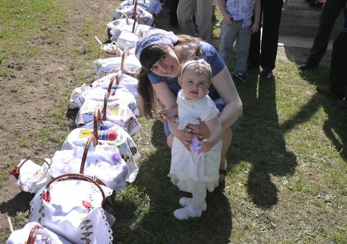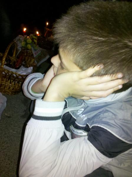 А це вже біля церкви, вартуємо корзинку чекаючи освячення і мнемо бочки зайчикам: я своєму, а Алька своєму