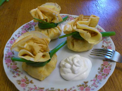 Начинка: Багато цибулі, куряче філе, вершки (молоко).