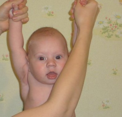 • дитина знаходиться на руках дорослого, проводяться погойдуючі рухи головного кінця вниз, виникає навантаження на м'язи шиї.