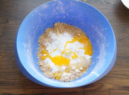 6. У цю масу додаємо муку та соду, знову перемішуємо - можна міксером, можна дерев'яною лопаткою, можна руками.