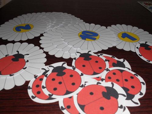 У племянницы скоро день рождения. Все будет в стиле божьей коровки. Поэтому как дополнение к основному подарку сделала  ей такую игру. Смысл игры: расставить на ромашки с цифрами божьих коровок так, чтоб цифра на цветку соответствовала количеству черных точек на божьей коровке. Вот такая простая игра направленная на изучение счета и распознавания цифр.