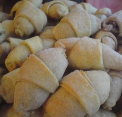 Розкатати трикутнички, покласти начинку і закрутити. Випікати при досить високій т-рі - в електричній духовці 220 град, а потім зняти на 190. Ще гарячими притрусити цукор-пудрою.