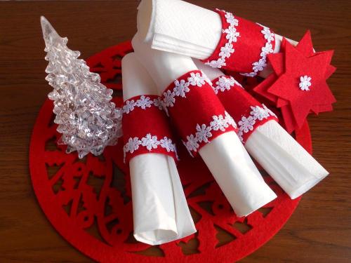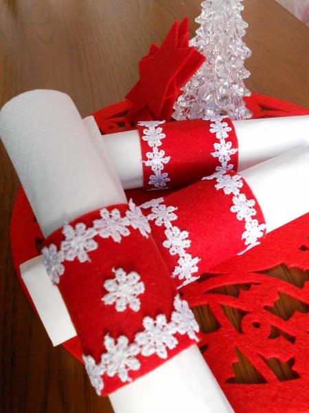 Сделала к новогоднему столу в красно-белых тонах вот такие кольца для салфеток. И думаю, что чего-то вроде не хватает. Хочется еще что-то добавить, а что никак не пойму. Может так?