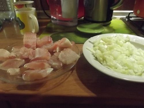 Из всего перечисленного сфотографировала уже только готовые кусочки рыбы и нарезанный лук: