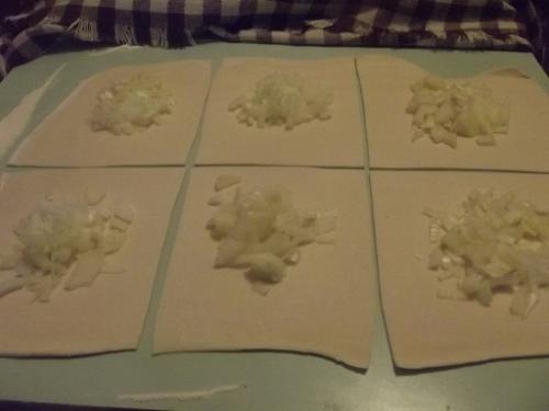 Раскатываем тесто толщиной примерно 3-5 мм, режем на квадраты примерно 15х15: