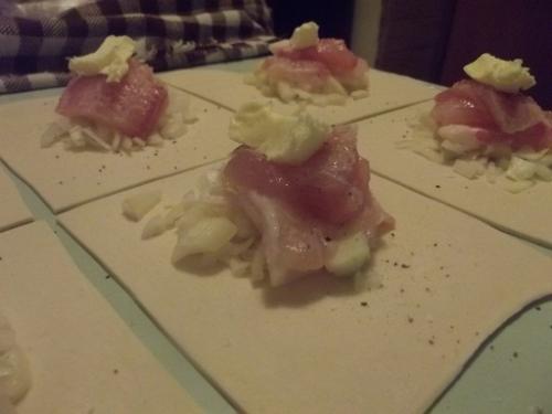 А еще по просьбе некоторых подруг выкладываю мини-МК по приготовлению блюда, которое у нас дома называется "Расстегайчики с рыбой". Конечно, это не в полной мере именно расстегаи, которые делаются из дрожжевого теста, но зато этот вариант идеально подходит для праздников, потому что: необычно, быстро, относительно дешево, неутомительно, и очень, очень вкусно!