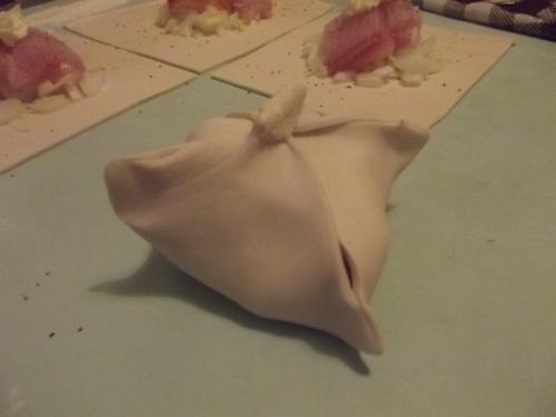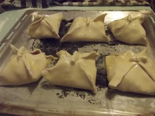Собираем наверх все уголки теста, в виде конвертика, хорошо защипываем и немножко заворачиваем, чтобы не разлиплись. Еще можно немного защипать внизу "окошек", чтобы сок не вытекал: