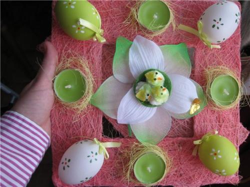 Керамічна тарілка, сізаль, покрашені опилки, декоративні яйця, квіточка+вклеєні всередину циплятка (готові - куплені).