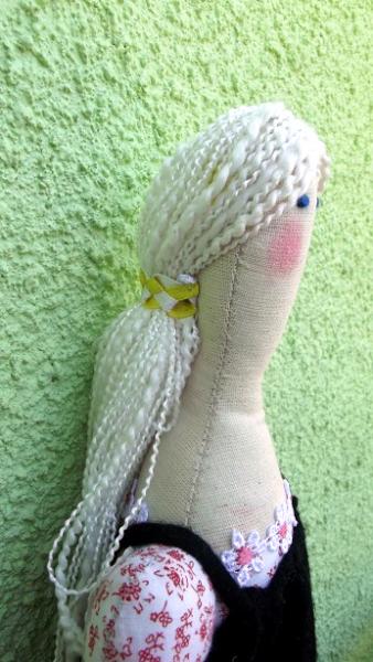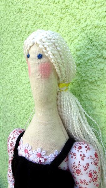 Рост куклы - 61 см. Материалы: хлопок, бязь, трикотаж, декоративная тесьма, ленты-атлас. Наполнитель - холлофайбер. И - под комбинезоном не видно, но у куколки тоже есть красивое белье