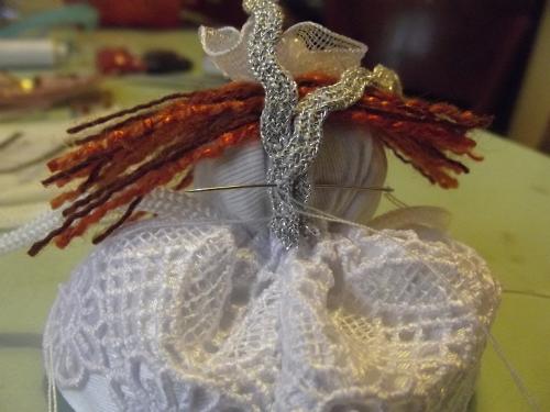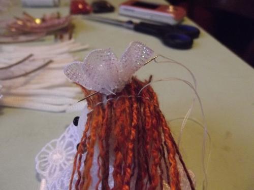 Шаг 7. Пришиваю волосы швом «назад иголка», начинаю спереди, заканчиваю, оставляя место на затылке для пришивания петли и крылышек, закрепляю, иголку вывожу примерно на середине головы для пришивания «коронки»: