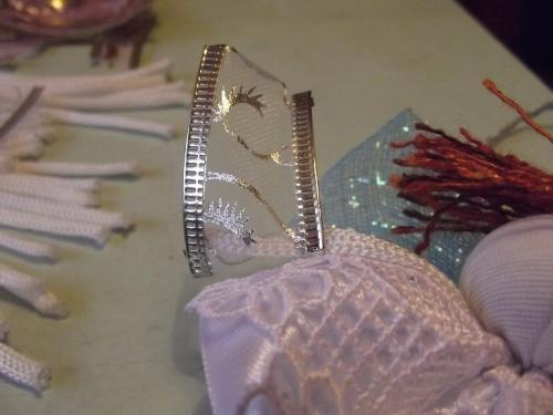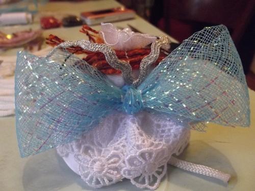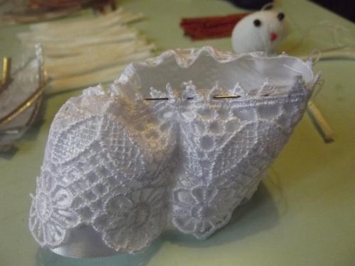 Шаг 4. Пришиваю комплекс ручки-ножки к голове, закрепляю; беру атласную ленту и кружево: