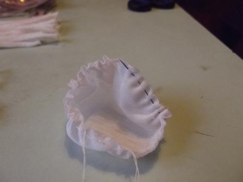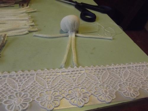 Шаг 6. Мелко присобираю платьице (мне удобно было пользоваться узором на кружевеJ), закрепляю, вставляю в отверстие юбочки ножки (ручки остаются снаружи, под головой), пришиваю потайным швом к голове, закрепляю: