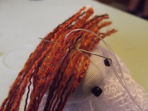 на голове начинаю делать лицо – ввожу иглу снизу головы, вывожу там, где первый глазик, цепляю черную бусину, закрепляю, выводя иглу через место для другого глазика, цепляю вторую черную бусину, закрепляю, выводя иглу к ротику, цепляю красную бусину, закрепляю нитку; иголку вывожу там на голове, где планируется начать пришивать волосы :