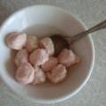 М'якоть телятини очищаємо від плівок і жиру і двічі пропускаємо через м'ясорубку. В отриманий фарш додаємо збитий заздалегідь яєчний білок, вливаємо молоко і солимо за смаком. З отриманої маси формуємо кульки близько 1 см в діаметрі. Для того, щоб кульки добре формувалися потрібно фарш помістити на дошку, яку добре змочуємо водою, а руки змастити яєчним білком. Потім сформовані кульки фрикадельок опускаємо в киплячий на слабкому вогні суп і ще кип'ятимо протягом 10 хвилин. Готові фрикадельки можна давати малюкові як окрему страву або з гарніром.