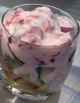 Ківі очистити від шкірки, нарізувати дрібними кубиками. Половинку банана очистити від шкірки і нарізувати кубиками. Яблуко нарізувати кубиками, апельсин потрібний для пікантності смаку - нарізувати дрібно-дрібно. Все перемішати і заправити йогуртом.