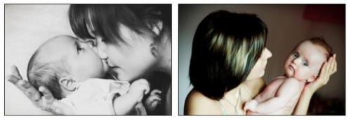 Немовлята до півтора-двох місяців: звичайно ж, лежачи, але не зверху, як ми звикли фотографувати, а з рівня очей. Або на руках у мами чи тата. Можна зняти личко малюка, що визирає з-за маминого плеча, ззаду.