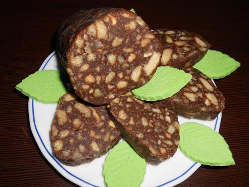 200 г масла, 1 стакан сахара, 5-6 ст. ложек молока, 4 полных с горкой ложек какао, ванилин. Все это на медленном огне растворить до однородной массы. В слегка остывшую массу добавляем измельченное печенье и рубленные орехи (по вкусу, я люблю чтоб было много орехов). Размешали. Выложили на плотный целован или фольгу (от фольги труднее потом отковыривать колбаску, но можно нарезать вместе с фольгой и потом чистить, точь как колбасу), сформировали руками колбаску и закрутили, все плотно утрамбовывая. И на некоторое время в холодильник. У меня буквально через пол часа уже все кушали шоколадную колбаску.