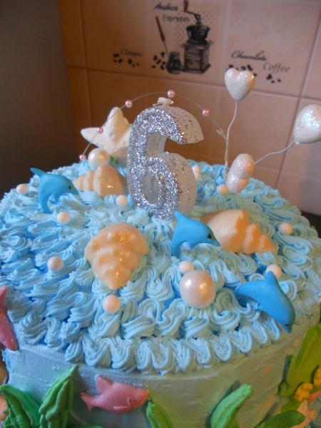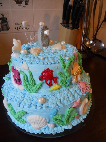 Были еще крекеры в виде рыбок, бутербродики с красной рыбкой в виде морской звезды. Ну и, конечно, торт. Правда с тортом я еще так никогда не мучалась. Все наотрез отказываются от мастики, пришлось украшать сливками, а украшения на этих сливках поплыли. В общем, я была расстроена, а дети даже не заметили. Их очень отвлекло обилие морских фигурок, которые можно скушать. Не смотря на не очень аппетитный внешний вид, тортик был вкусный. А вот и он