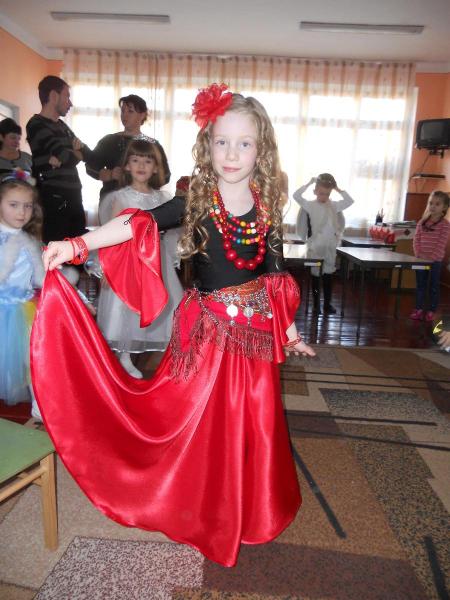 Сшила юбку солнце. Из маленького трико танцевального сделала кофточку: обрезала низ, пришила широкие рукава, бахрому. Купила платок и обшила бахромой. На пояс платок и сверху пояс из монеток железных, на руки браслеты и кольца, в волосы цветок, на шею много бус. Прическа и обязательнно лак для волос с блестками