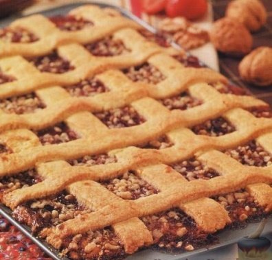 Яблука очищають і натирають на великій тертці. Ядра волоських горіхів подрібнюють. Половину тіста розкачують у пласт за величиною дека, на нього кладуть горіхи, яблука і посипають цукром. З решти тіста розкачують тонкі джгутики, кладуть їх на пиріг у вигляді решітки, яку змащують збитим яйцем, посипають горіхами, випікають.