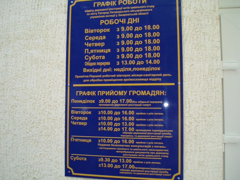 9.30 – 13.00 з 13.00 до 17.00 (тільки реєстрація шлюбів)