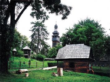 Серед споруд - 250-літня хата з присілка Ясіні Кевелова, збудована з великих колотих ясеневих колод; гуцульська ґражда з с. Стебного Рахівького району; стара хата з с. Тибава зі Свалявщини, в якій, можливо, народився відомий історик, філолог і етнограф Юрій Венелін (Гуца), дерев'яна корчма. Та найцікавіший і найвишуканіший "експонат" - бароккова лемківська дерев'яна Михайлівська церква з с. Шелестова (1777) з високою баштою-дзвіницею.